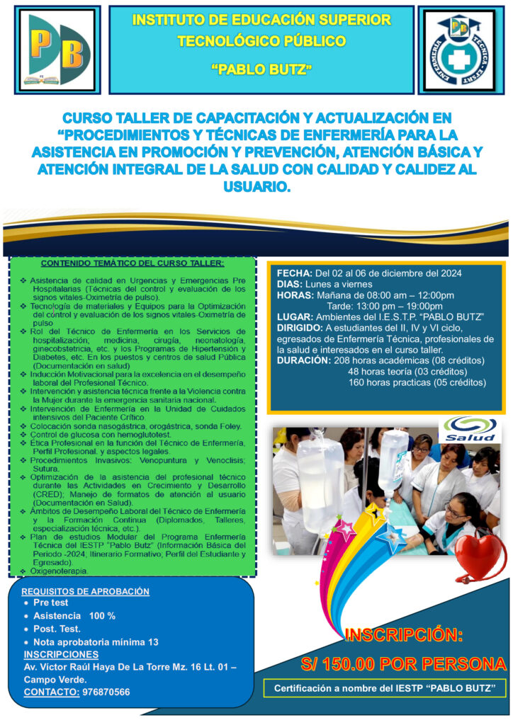 CURSO TALLER DE CAPACITACIÓN Y ACTUALIZACIÓN EN “PROCEDIMIENTOS Y TÉCNICAS DE ENFERMERÍA PARA LA ASISTENCIA EN PROMOCIÓN Y PREVENCIÓN, ATENCIÓN BÁSICA Y ATENCIÓN INTEGRAL DE LA SALUD CON CALIDAD Y CALIDEZ AL USUARIO – 2024